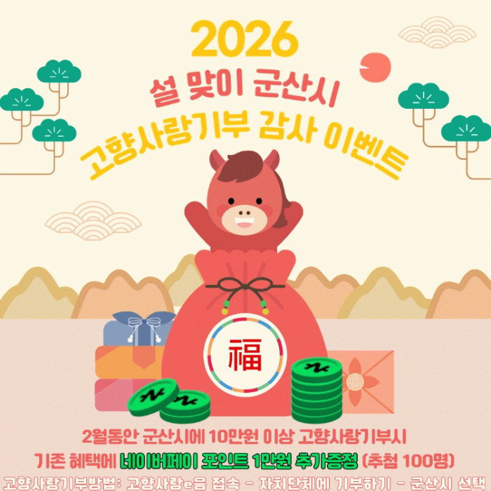 군산시 관계자는 “설 명절을 맞아 고향을 사랑하는 마음을 보내주시는 기부자분들께 감사의 마음을 전하고자 이번 이벤트를 마련했다.”라며, “앞으로도 건전한 기부 문화 조성과 지역 경제 활성화를 위해 다양한 홍보 활동을 이어가겠다.”라고 말했다.