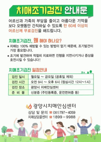 이에 광양시치매안심센터는 특별한 증상이 없더라도 60세 이상 어르신의 경우 연 1회 정기적인 치매 조기검진을 받을 것을 권장하고 있다.