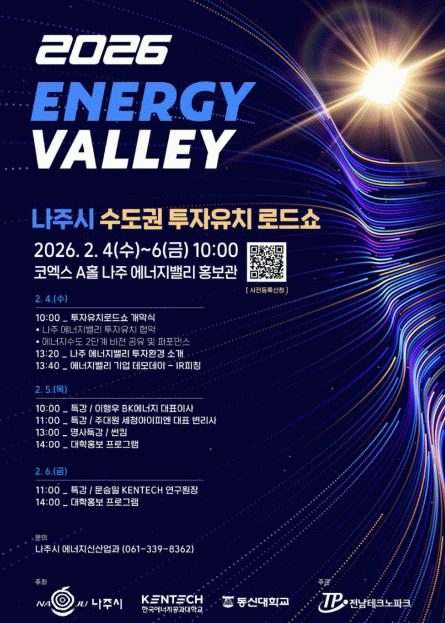 나주시는 오는 2월 4일부터 6일까지 3일간 서울 코엑스에서 ‘2026년 수도권 투자유치 로드쇼’를 열고 에너지 기업 유치 및 투자 활성화에 나선다고 29일 밝혔다.