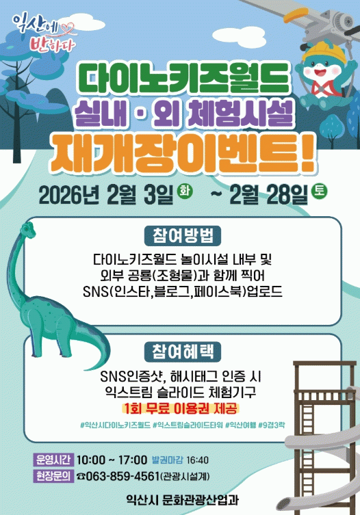 익산시는 오는 2월 3일부터 다이노키즈월드 실내외 놀이체험시설을 재개장한다고 29일 밝혔다.