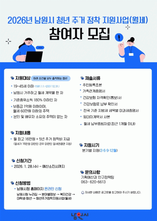 세부 사항은 남원시 누리집을 참고하거나 기획예산과 인구정책팀(☎063-620-6613)으로 문의하면 된다.