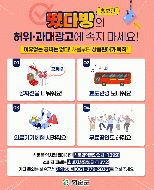 또한 피해가 생겼을 경우 식품안전 관련 위법행위는 식품의약품안전처, 소비자 피해는 소비자상담센터에서 신고할 수 있으며, 기타 문의는 화순군청 지역경제과로 하면 된다.