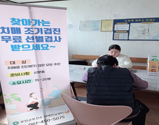 무안군치매안심센터에서는 치매 전문교육을 이수한 직원이 치매 선별검사를 실시하고 있으며, 검사 결과에 따라 진단·감별검사 연계, 전 군민 치매치료비 지원, 맞춤형 인지 강화 프로그램 참여 등 단계별 서비스를 제공하고 있다.