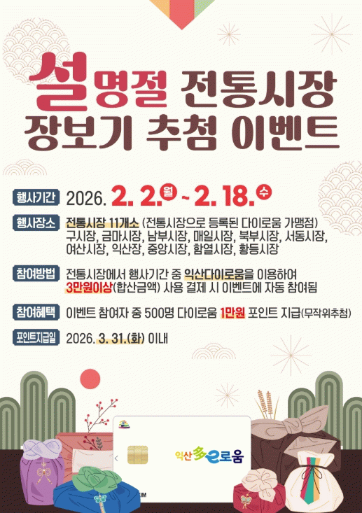 익산시는 2월 2일부터 18일까지 '설맞이 전통시장 장보기 추첨 이벤트'를 진행한다고 30일 밝혔다.