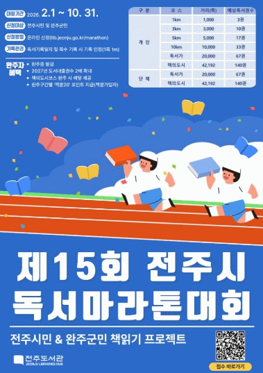한편 제15회 전주시 독서마라톤 대회는 오는 2월 1일부터 전주도서관 누리집을 통해 신청할 수 있으며, 기타 자세한 사항은 전화로 문의하면 된다.