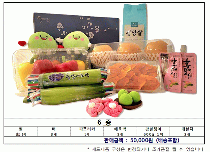 이번 선물세트는 광양농협과 협업해 추진됐으며, ▲쌀 ▲배 ▲파프리카 ▲애호박 ▲감말랭이 ▲매실청 등 광양에서 생산된 우수 농특산물 6개 품목으로 구성됐다.