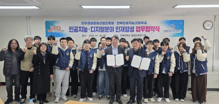 (재)전주정보문화산업진흥원(이하 진흥원)은 30일 전북대학교 평생교육원에서 전북인공지능고등학교(이하 전북인공지능고)와 인공지능·디지털 분야 인재 양성 및 지역 산업·교육 발전을 위한 업무협약을 체결했다.