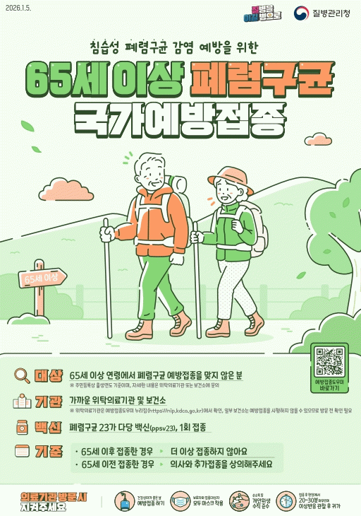 접종 대상은 폐렴구균 예방접종을 한 번도 맞지 않은 65세 이상(1961.12.31.이전 출생자)이며, 폐렴구균 23가 다당백신을 1회 무료로 접종받을 수 있다.