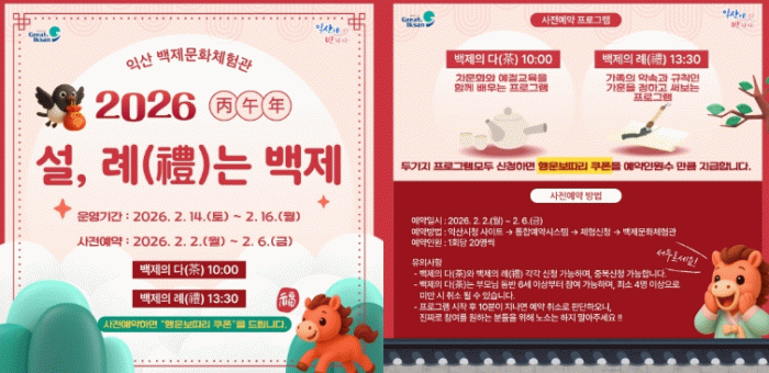시 관계자는 "설 명절의 전통적 의미에 백제 문화를 접목한 이번 프로그램을 통해 방문객들이 역사와 문화를 더욱 가깝게 느끼고, 가족과 함께 즐거운 명절 추억을 만들 수 있기를 바란다"고 말했다.