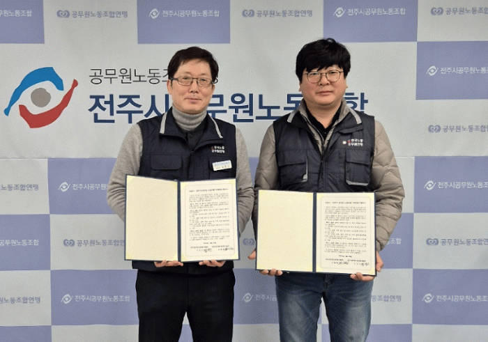 전주시공무원노동조합(위원장 김경오)은 지난달 30일 전주시청 내 노동조합 사무실에서 안동시공무원노동조합(위원장 유철환)과 자매결연 협약식을 가졌다고 밝혔다.