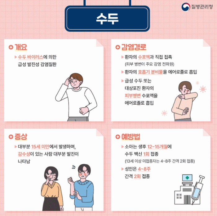 수두는 수두-대상포진 바이러스에 의해 발생하는 제2급 법정감염병으로 겨울에서 봄철에 유행하고 주로 소아에게 발생하며 전염력이 매우 높은 것이 특징이다.