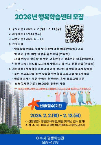 여수시 관계자는 “행복학습센터는 주민이 주도적으로 참여해 마을 공동체를 활성화하는 평생학습 거점”이라며 “학습을 통해 이웃과 소통하고 지역에 활력을 더하고자 하는 마을과 아파트의 많은 관심과 참여를 바란다”고 말했다.