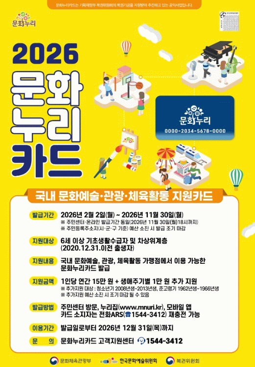 문화누리카드는 문화예술·국내여행·체육활동 이용을 지원하는 제도로, 2026년에는 지난해 대비 1만 원 인상된 연간 15만 원이 지원된다.