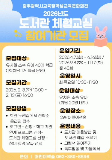 자세한 내용은 회관 누리집 또는 학생교육문화회관 어린이책숲에서 확인하면 된다.