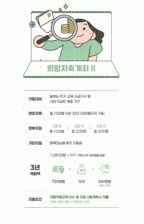 ‘희망저축계좌2’는 근로·사업 소득이 있는 주거·교육 급여 수급 가구 또는 차상위계층이 저축하는 경우, 정부가 일정 금액의 근로소득 장려금을 지원해주는 사업이다.