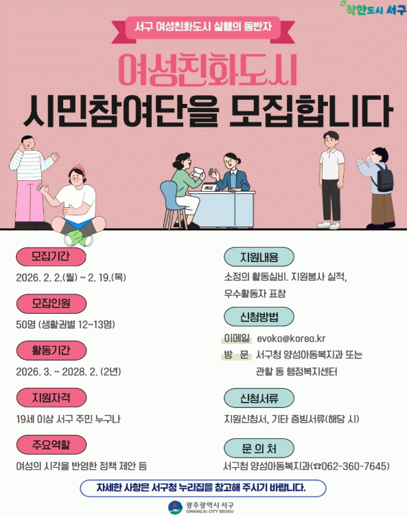 김민정 양성아동복지과장은 “시민참여단 분과 운영을 통해 주민 참여의 폭을 넓히고 생활 현장에서 체감할 수 있는 여성친화도시 정책을 추진하겠다”며 “지역 정책에 관심 있는 주민들의 적극적인 참여를 바란다”고 말했다.