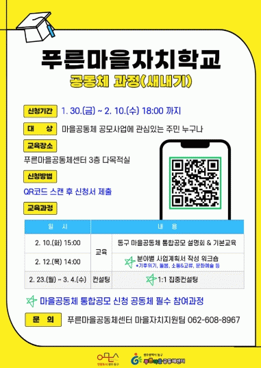 ‘푸른마을자치학교 공동체 과정(새내기)’ 참여를 희망하는 주민은 동구 푸른마을공동체센터 마을자치지원팀으로 문의하면 된다.