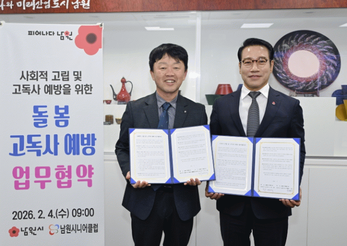 남원시 관계자는 “이번 협약은 사회적 고립과 고독사라는 사회적 문제에 대응하기 위한 선제적이고 실질적인 돌봄 모델”이라며 “지역 어르신들의 경험과 역량을 활용해 위기가구를 살피는 만큼, 돌봄의 질을 높이는 동시에 공동체 회복에도 큰 역할을 할 것으로 기대한다”고 말했다.