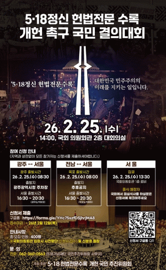 광주광역시(시장 강기정)는 전국 시민사회단체, 종교계, 오월단체, 광주시, 전남도 등으로 구성된 ‘5·18 헌법전문 수록 개헌 국민추진위원회’(이하 추진위원회)가 오는 25일 오후 2시 국회 의원회관 2층 대회의실에서 ‘5·18정신 헌법전문 수록 개헌 촉구 국민결의대회’를 개최한다고 4일 밝혔다.