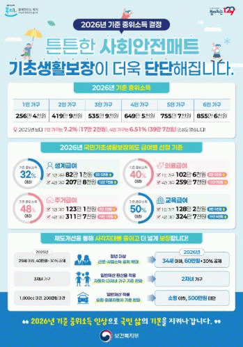 정광선 전남도 보건복지국장은 “2026년 기준중위소득 인상과 제도 개선을 통해 8천700여 가구가 기초생활 보장을 받게 됐다”며 “앞으로도 생활이 어려운 도민의 삶의 질 향상을 위해 제도개선 활성화로 더 촘촘하고 안전한 복지망을 만들겠다”고 말했다.