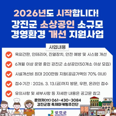 신청은 오는 3월 13일까지 가능하며 읍·면사무소 방문 또는 등기우편 접수, 강진군 누리집 ‘소상공인지원센터’를 통한 온라인 접수도 가능하다.
