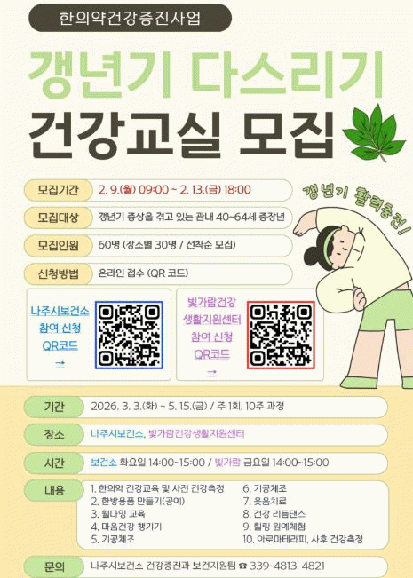프로그램은 3월 3일부터 5월 15일까지 주 1회, 총 10회 과정으로 운영되며 나주시보건소에서는 매주 화요일, 빛가람건강생활지원센터에서는 매주 금요일에 각각 진행된다.