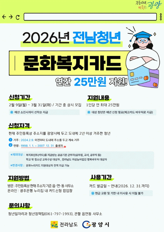 한편, 전남청년 문화복지카드 지원사업은 매년 도내 청년들의 높은 관심 속에 추진되고 있으며, 지난해에는 10,204명의 청년이 참여해 문화·자기계발 활동을 지원받았다.