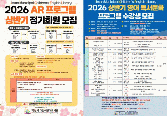 익산시는 어린이영어도서관에서 상반기 AR(영어독서능력향상)·마이온(myON) 정기 회원을 모집한다고 10일 밝혔다.