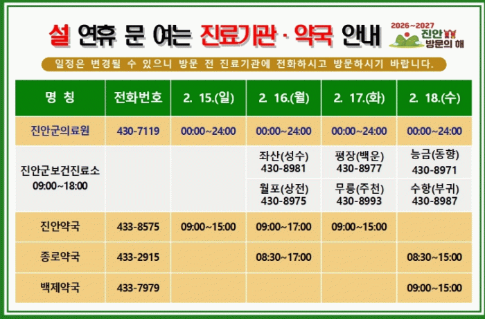 이번 설 연휴 기간 비상 진료 기관은 지역 응급의료 기관인 진안군 의료원을 비롯해 휴일 지킴이 약국 3개소로 일자별·당번제로 지정 운영된다.
