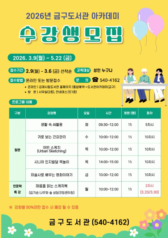 수강 신청은 김제시립도서관 홈페이지를 통한 온라인 접수 또는 금구도서관 방문 접수가 가능하다. 김제시민이라면 누구나 참여할 수 있으며 수강료는 무료다.