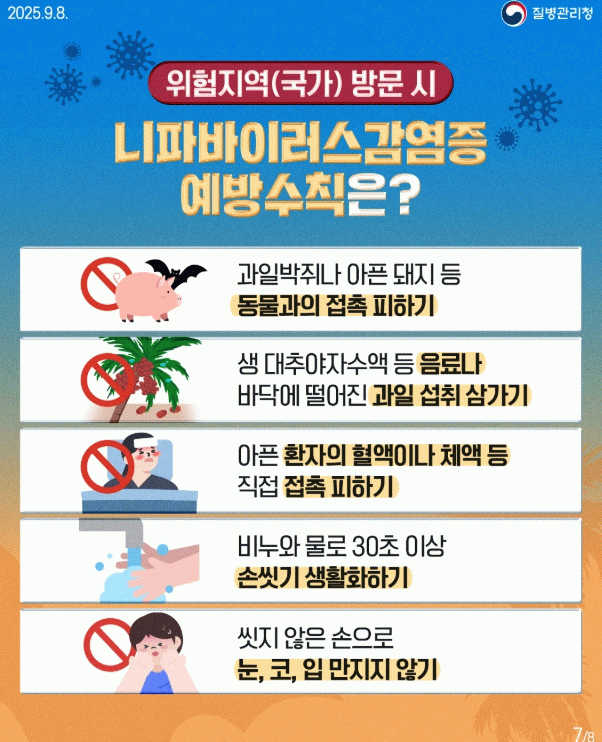 또한 인도·방글라데시 등 니파바이러스 발생 국가를 방문한 후 귀국 14일 이내 발열, 두통, 인후통 등 의심 증상이 있으면 즉시 질병관리청이나 관할 보건소로 신고해야 한다.