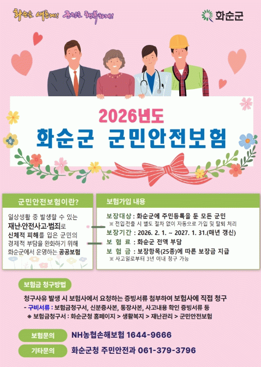 조영균 주민안전과장은 “군민안전보험이 실제 사고 상황에서 도움이 되는 제도로 자리 잡도록 보장 내용 안내와 보험금 청구 지원을 한층 강화하겠다”라며, “앞으로도 군민이 실질적으로 체감할 수 있는 안전 정책을 지속적으로 확대해 나가겠다”라고 말했다.