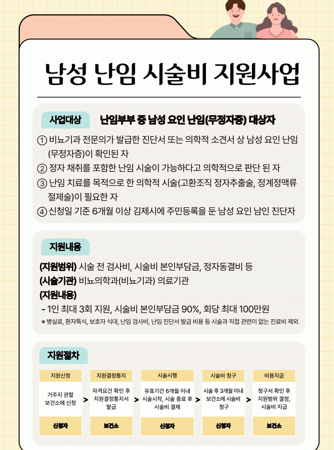 홍순화 건강증진과장은“남성 난임에 대한 지원을 통해 난임 치료의 사각지대를 해소하고, 아이를 원하는 가정에 실질적인 도움이 될 수 있도록 노력하겠다”고 말했다.