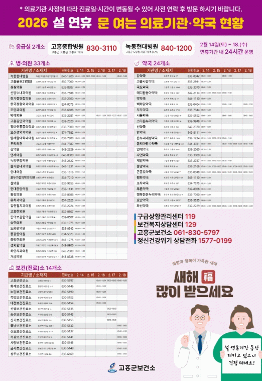 한편, 설 연휴 기간 진료가 가능한 의료기관과 약국 정보는 고흥군보건소 누리집이나 응급의료포털에서 확인할 수 있으며, 고흥군 보건소로 문의하면 자세히 안내받을 수 있다.
