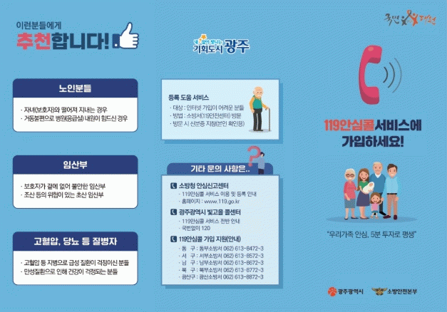 김희철 광주소방안전본부 119대응과장은 “명절에는 응급상황이 예고없이 발생할 수 있어 평소 대비가 곧 골든타임을 지키는 길”이라며 “가족의 안전을 위해 119안심콜에 미리 가입해 안심하고 편안한 명절을 보내길 바란다”고 말했다.