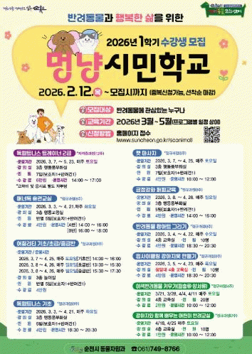 1학기 강좌 신청은 12일부터 순천시 반려동물문화센터 누리집을 통해 선착순으로 모집한다.