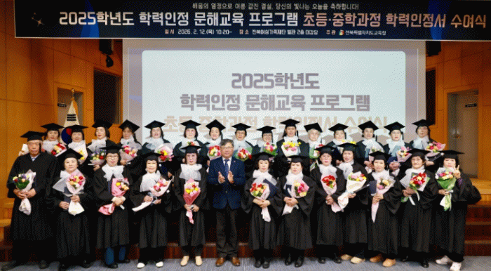 전북특별자치도교육청은 12일 전북여성가족재단 별관 2층 대강당에서 유정기 교육감 권한대행이 참석한 가운데 ‘2025학년도 학력인정 문해교육 프로그램 학력인정서 수여식’을 개최했다.