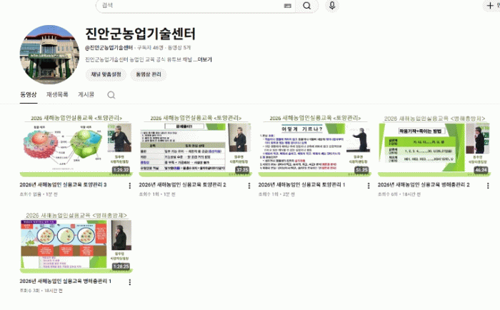 현재 채널에는 ‘2026 새해농업인실용교육’영상이 업로드 되어 있으며, 진안군 주요 작목인 ▲고추 ▲노지수박 ▲콩 ▲병해충관리 ▲토양관리 등 핵심 재배 기술을 담고 있다. 농업인들은 현장에서 작업하거나 이동 중에도 필요한 구간을 반복 시청할 수 있어, 최신 영농 기술 습득 및 경영비 절감에 큰 도움이 될 전망이다.