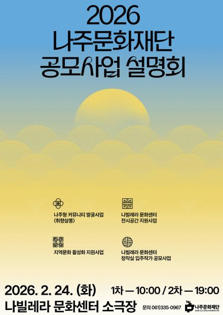 나주문화재단은 오는 2월 24일 나빌레라문화센터 소극장에서 ‘2026년 나주문화재단 통합 공모사업설명회’를 연다고 13일 밝혔다.