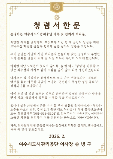 공단은 이번 서한문을 통해 명절 분위기에 편승한 부적절한 관행을 차단하고, 청렴을 조직의 최우선 가치로 확고히 하겠다는 의지를 재확인했다. 또한 명절 선물 대신 서로의 안부를 묻는 ‘따뜻한 덕담’을 나누는 문화를 제안하며, 직무와 관련해 일체의 금품이나 향응을 받지 않는 ‘건전하고 투명한 명절 문화’ 정착을 독려했다.