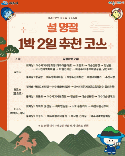시 관계자는 “설 연휴 동안 여수를 찾는 귀성객과 관광객들이 소중한 추억을 만들길 바란다”며 “여수의 다양한 매력을 경험하고 알찬 국내 여행지로 다시 오고 싶은 여수로 기억되길 기대한다”고 전했다.