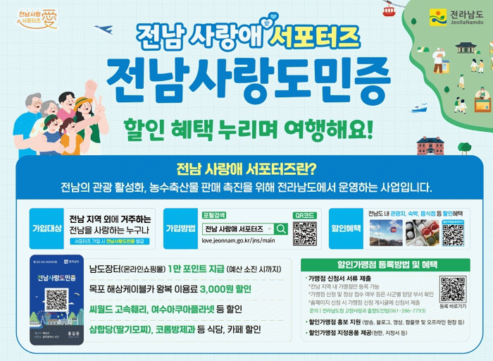 ‘전남 사랑애 서포터즈’는 전남 외 지역에 거주하면서 전남을 응원하고 방문하는 사람이라면 누구나 가입할 수 있는 참여형 정책이다. 가입자에게는 지역 주요 관광지, 숙박, 레저, 식당, 카페 등 940여 할인가맹점에서 혜택을 받을 수 있는 ‘전남사랑도민증’이 발급된다.