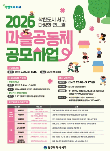 김이강 서구청장은 “어려운 재정 여건 속에서도 마을공동체 공모사업 예산을 확보했다”며 “주민 스스로 마을의 현안을 발굴하고 해결하는 과정을 통해 서로 다정하게 연결되는 착한도시 서구를 실현하겠다”고 말했다.