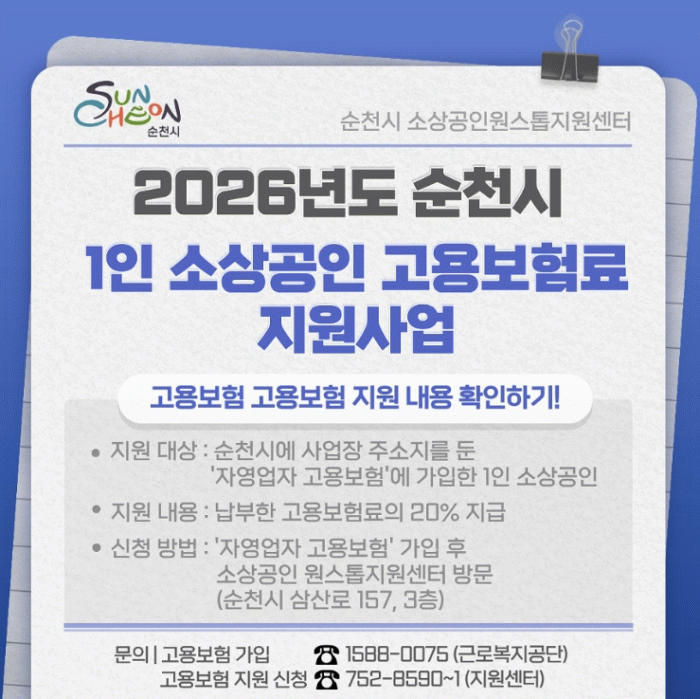 지원 대상은 근로복지공단의 자영업자 고용보험에 가입한 1인 소상공인으로, 신청은 순천시 소상공인 원스톱지원센터(순천시 삼산로 157, 시민협력센터 3층)를 방문해 현장 접수하면 된다.