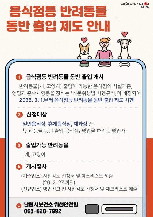 시 관계자는 “반려동물을 가족으로 여기는 시민들이 안심하고 외식을 즐길 수 있는 환경을 조성하고, 비반려인도 불편 없이 이용할 수 있는 상생의 외식문화를 만들어가겠다”며 “성공적인 제도 정착을 위해 영업자와 소비자 모두의 적극적인 참여를 바란다”고 말했다.
