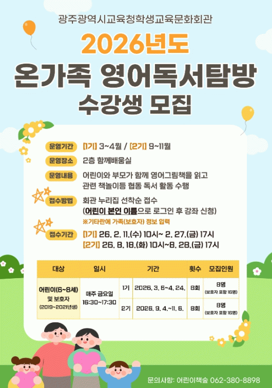 ‘온가족 영어독서탐방’은 6~8세 어린이와 가족이 함께하는 프로그램으로, 어린이와 보호자가 2인1조(기수별 8조(16명))를 이뤄 매주 금요일(총 8회)마다 영어 독후 활동을 진행한다.