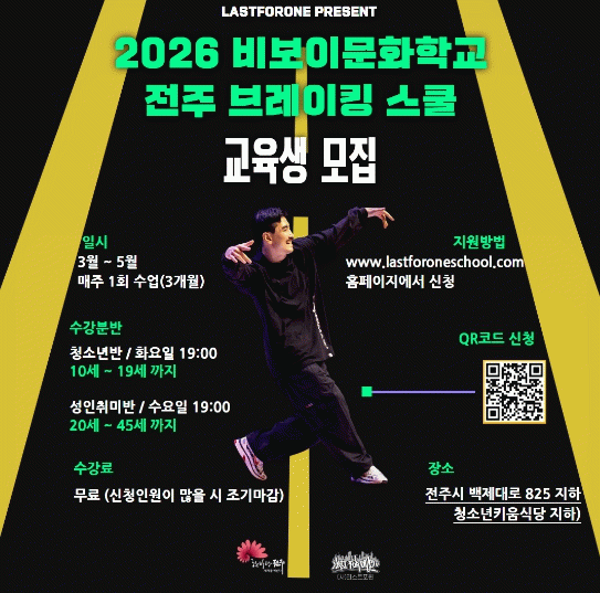 조성국 (사)라스트포원 대표는 “누구나 즐겁게 시작할 수 있도록 구성한 교육으로, 전주에서 브레이킹을 일상 속 스포츠이자 문화로 자연스럽게 배우는 계기가 되길 기대한다”고 밝혔다.