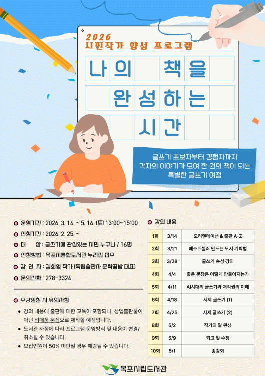 완성된 작품은 참여자들의 글을 모아 한 권의 책으로 제작된다. 도서관은 이번 프로그램이 시민들의 창작 경험을 지역 문화 자산으로 확장하는 계기가 될 것으로 기대하고 있다.