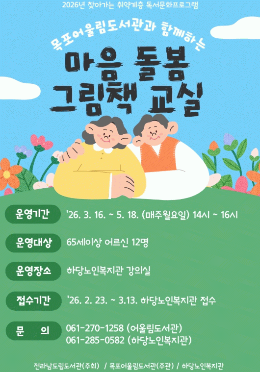 참여 신청은 2월 23일부터 하당노인복지관에서 가능하며, 자세한 사항은 목포어울림도서관으로 문의하면 된다.