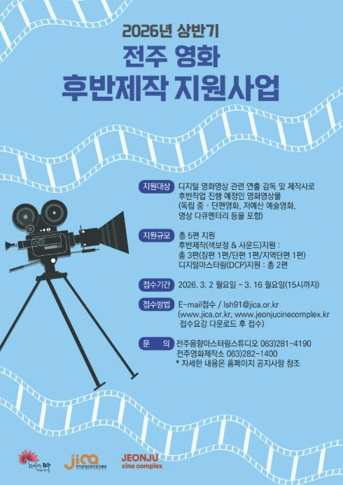 (재)전주정보문화산업진흥원과 전주영화제작소는 오는 3월 16일까지 대한민국 독립영화 제작 환경개선과 우수 작품을 발굴하기 위한 ‘2026년 상반기 전주 영화 후반제작지원 사업’에 참여할 작품을 공개 모집한다고 23일 밝혔다.